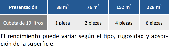 En la siguiente tabla se muestran algunos ejemplos de rendimientos con base en la presentación del producto.
